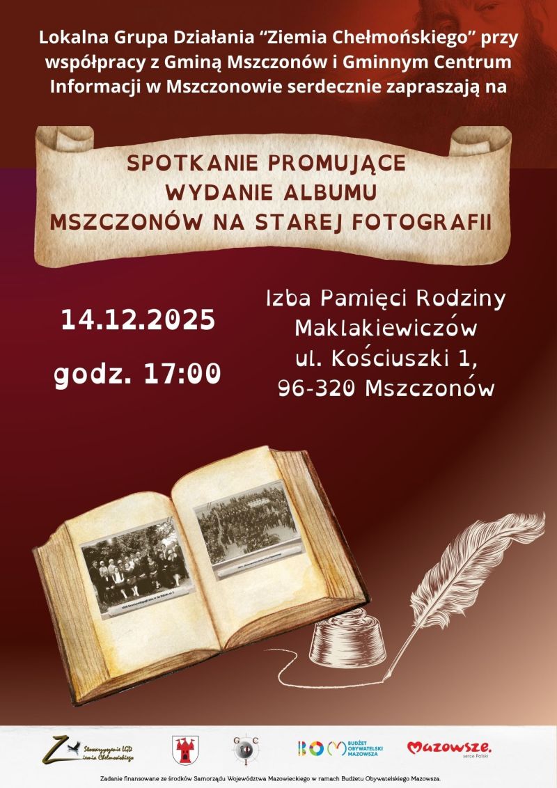 W dniu 14.12.2025 w Izbie Pamięci Rodziny Maklakiewiczów odbyło się spotkanie promujące wydanie albumu „Mszczonów na starej fotografii”, na którym zaproszeni prelegenci Piotr Dymecki i Aleksandra Kacprzak oraz osoby zaangażowane w przygotowanie publikacji opowiedzieli o pracach związanych z przygotowaniem albumu oraz ukazanej Historii Ziemi Mszczonowskiej na zawartych w nim fotografiach. Zadanie „Z Kroniki Ziemi Mszczonowskiej” jest finansowane ze środków Samorządu Województwa Mazowieckiego w ramach Budżetu Obywatelskiego.