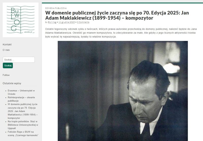 Na blogu Biblioteki Uniwersyteckiej w Warszawie ukazał się artykuł poświęcony Janowi Adamowi Maklakiewiczowi (1899-1954), wybitnemu kompozytorowi, dyrygentowi, pedagogowi i publicyście muzycznemu. Publikacja powstała we współpracy z Izbą Pamięci Rodziny Maklakiewiczów, która przekazała większość fotografii i materiałów ikonograficznych wykorzystanych w tekście.